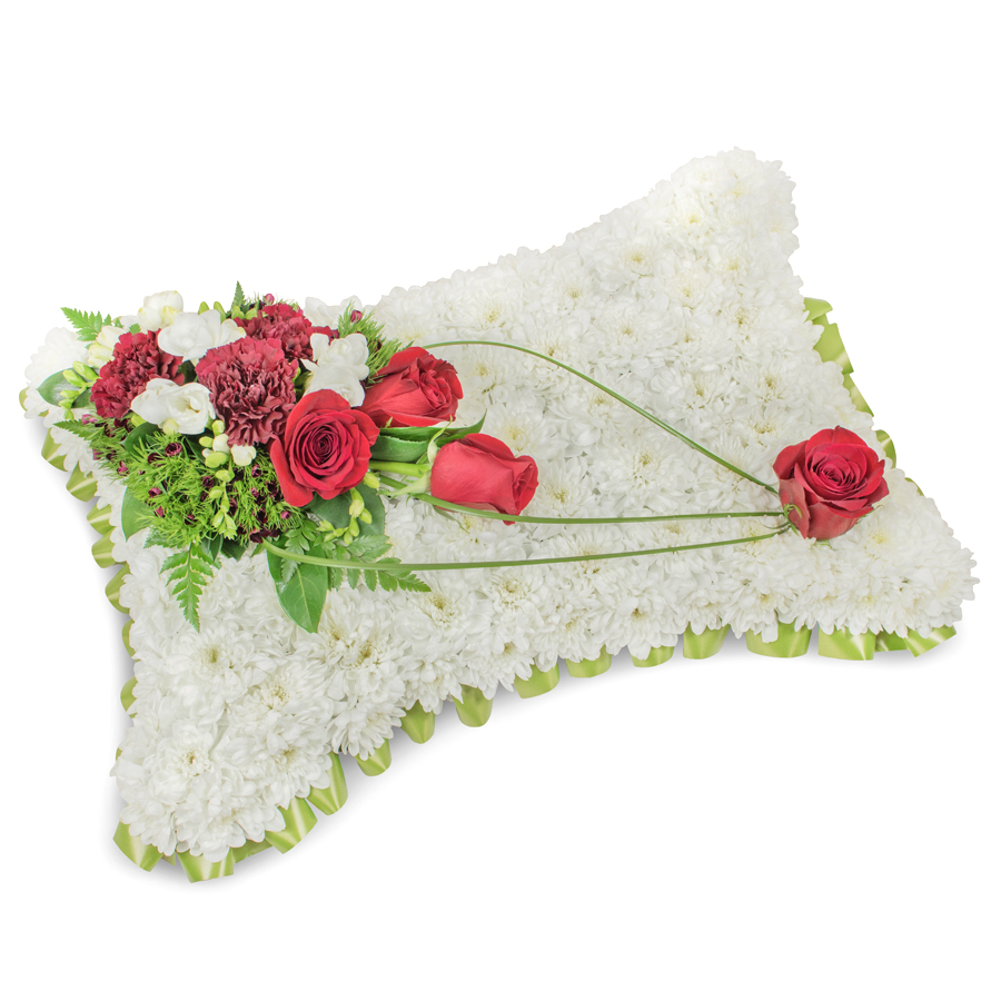 Express your sympathy with our graceful condolence bouquet, featuring a unique combination of white chrysanthemums, red roses, white freesias, and dark red carnations. Accented with dianthus and bear grass, this arrangement is a testament to elegance and thoughtfulness.